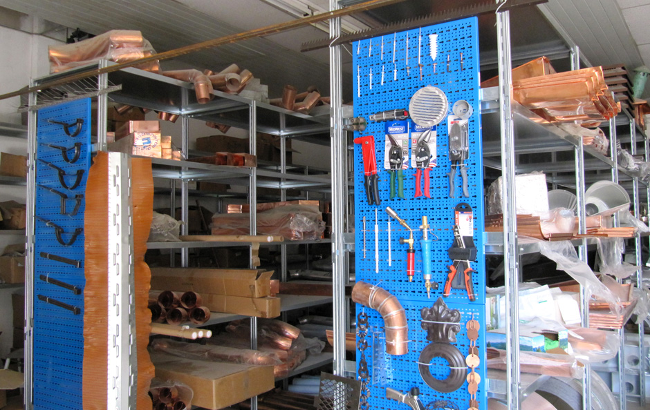 Disponiamo di un grande magazzino fornito di ogni pezzo di ricambio e accessori per tetti e grondaie quali bandelle, raccordi, bocchette, sostegni, testate, tiranti, catene, collari, copri bicchieri, distanziatori, doccioni, tasselli, viti, rivetti, chiodi, borchie, ganci, griglie, staffe, sottocolmi, pettini, lamiere, fascette di blocco, fermacoppi e fermaneve.
